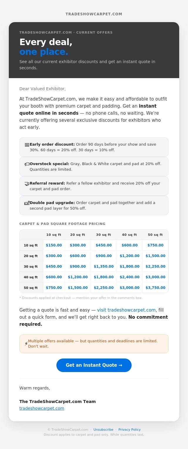 Related Posts News We have extra carpet — and you get 20% off News Overstocked Special News A Trade Show Consultant’s Complete Cost Breakdown We have extra carpet — and you get 20% off End of Year ’24 Special
